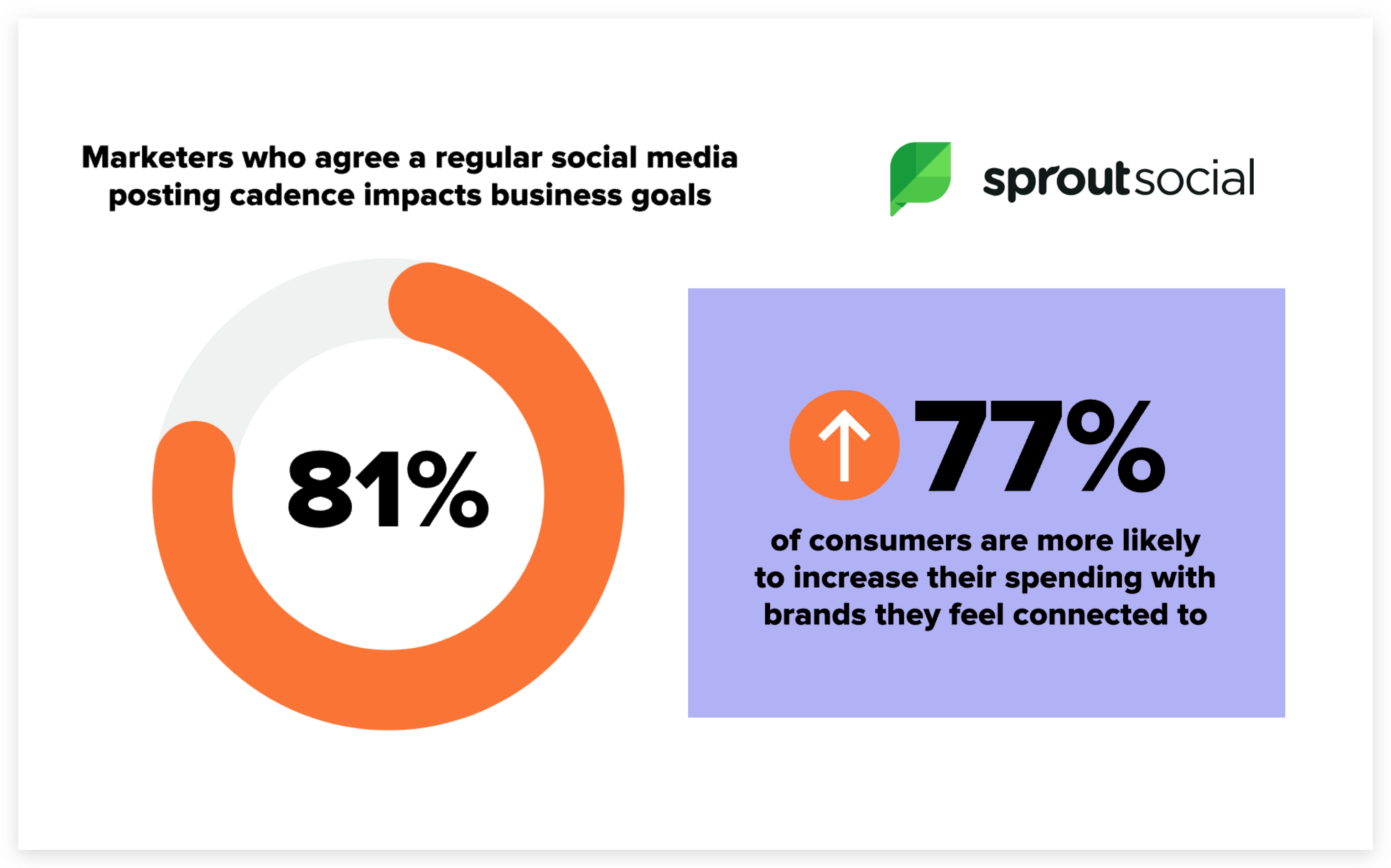 "A survey of 300 marketers found that 77% of consumers are more likely to increase their spending with brands they feel connected to and 81% of marketers also said maintaining a regular posting cadence on social positively impacts their business goals."