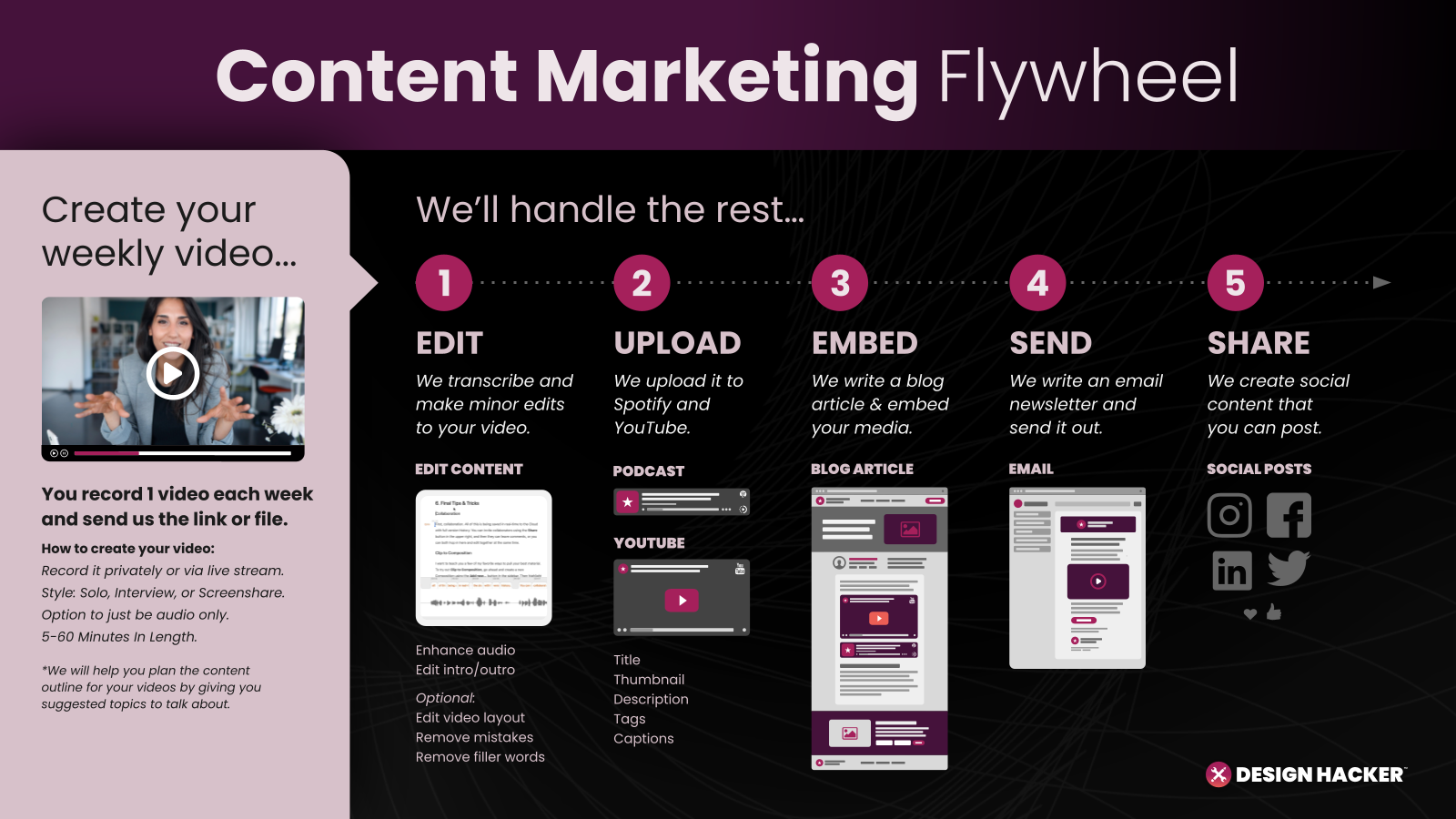 We edit your recording, make basic enhancements, and repurpose it into multiple formats. This becomes your Podcast, YouTube videos, blog articles, and weekly email newsletter. We also turn it into social media content that you can post.
