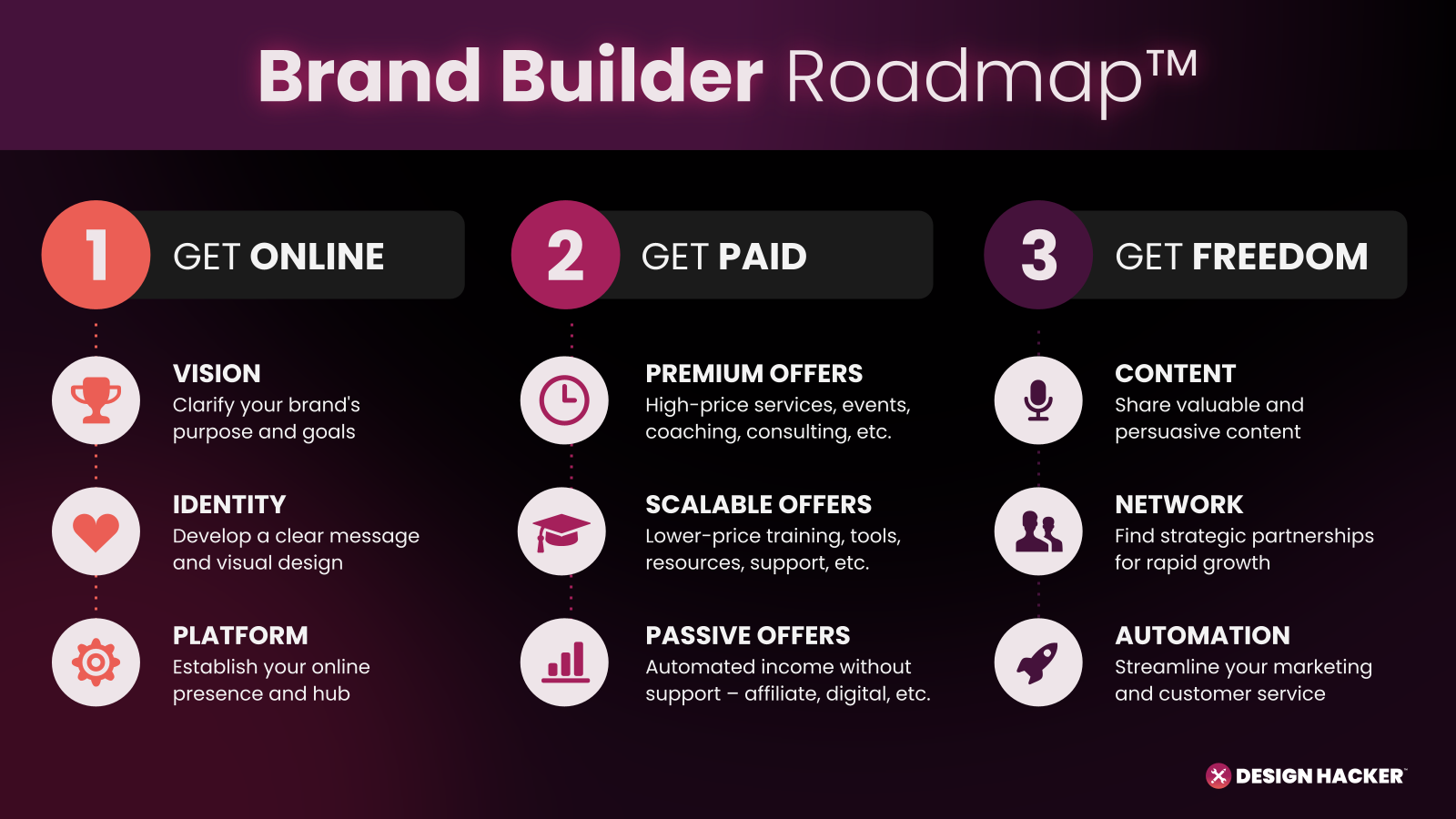 The Brand Builder Roadmap is a proven framework that guides you through the essential stages of building your Authority Brand Framework, from laying the foundation to scaling your impact and revenue.